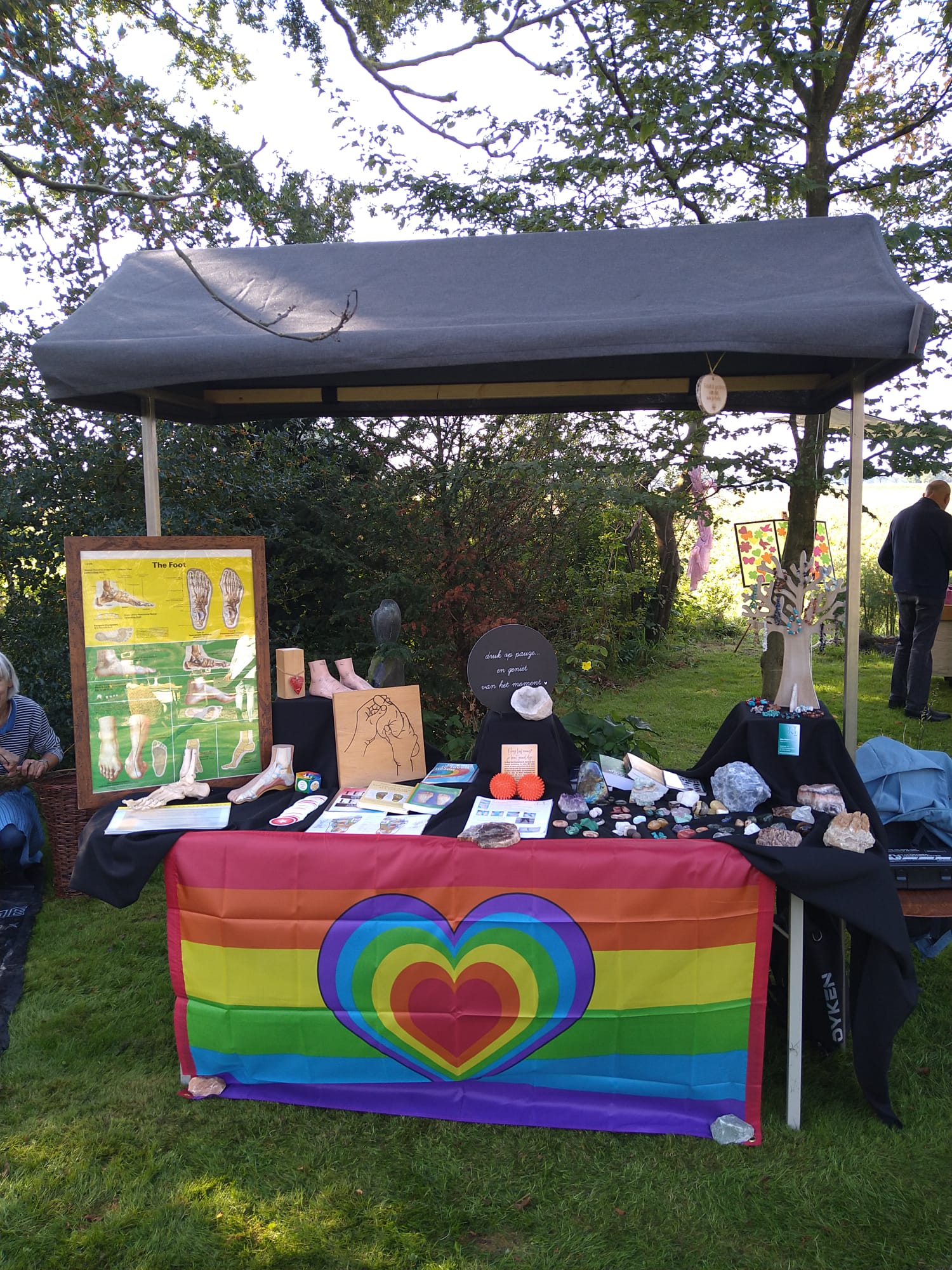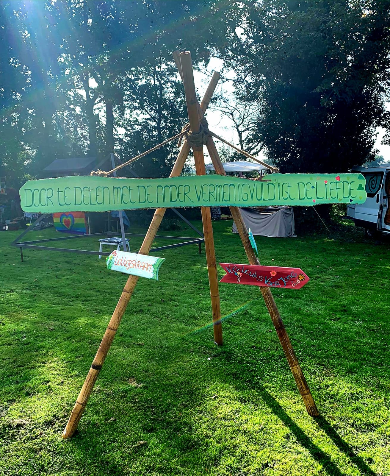 Als bezoeker kwam je na de welkomstkraam, waar je persoonlijk werd verwelkomd, op het festivalterrein waar ‘Door te delen met de ander vermenigvuldigt de liefde’ centraal stond. Het hele festivalterrein was aangekleed met kraampjes, met bloemen, met leuke kleurrijke wegwijsbordjes, met gezellige zitjes en een kampvuurtje.
