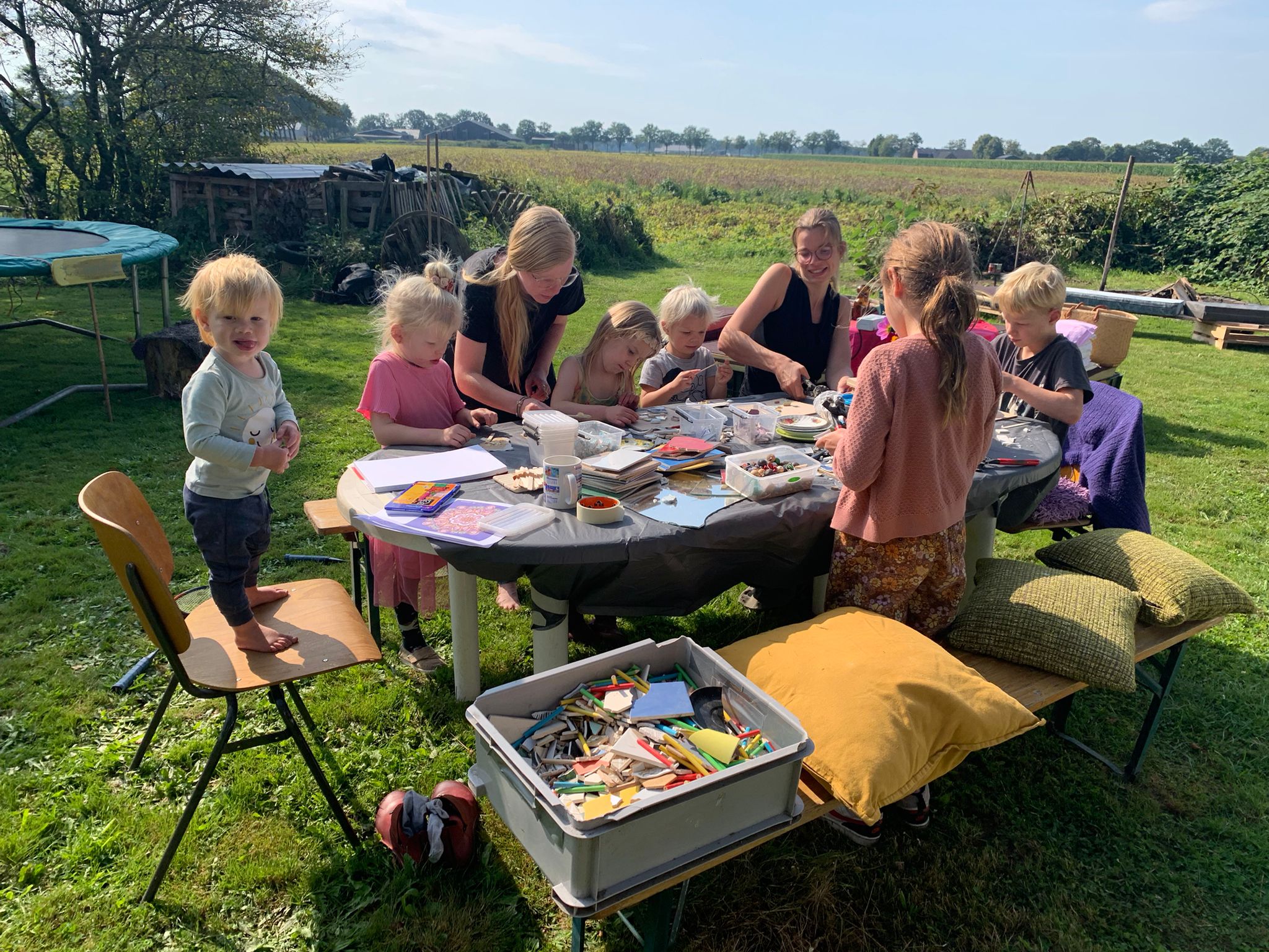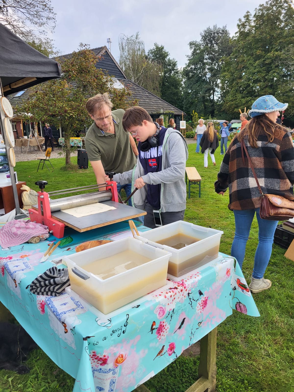 Aan het eind van deze geslaagde dag was er geen afval op ons terrein. We hebben nl. geen wegwerpborden en bekertjes gebruikt. Iedereen kon een bord/mok/bestek gebruiken om te eten en te drinken. Na afloop konden ze in de afwasstraat hun eigen gebruikte spulletjes afwassen en terug op de stapel zetten.