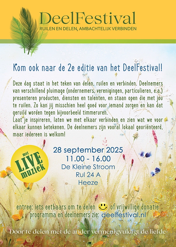 Stel je voor: op zondag 28 september 2025, in de vroege ochtend, fiets je Heeze binnen en volg je de slingerende weg naar De Kleine Stroom. Deze ecologische locatie, direct gelegen aan de rand van Heeze en grenzend aan natuurgebied Strabrechtse Heide, ademt rust en inspiratie. Als je goed oplet, voel je dat de natuur hier gewoon mag zijn, je wordt er als vanzelf relaxed van. Op deze prachtige plek laten we dit jaar de kernwaarden van het Deelfestival nóg sterker spreken: Natuurlijk verbinden naast ruilen en delen.